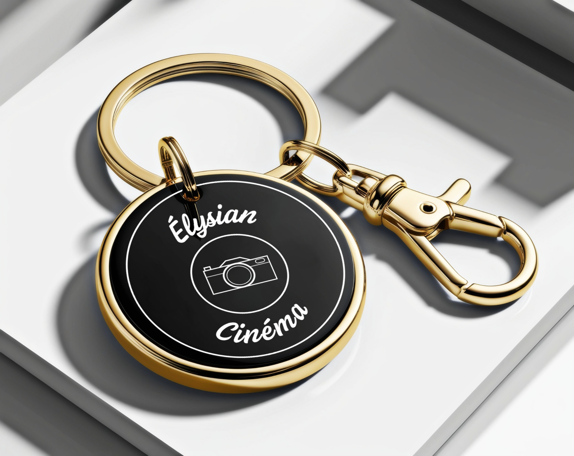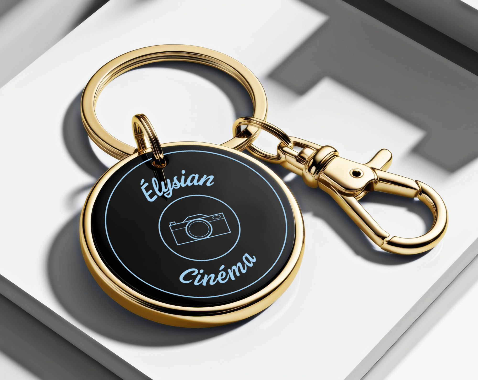 Porte-clé doré avec logo bleu ou blanc, un accessoire élégant pour vos clés.